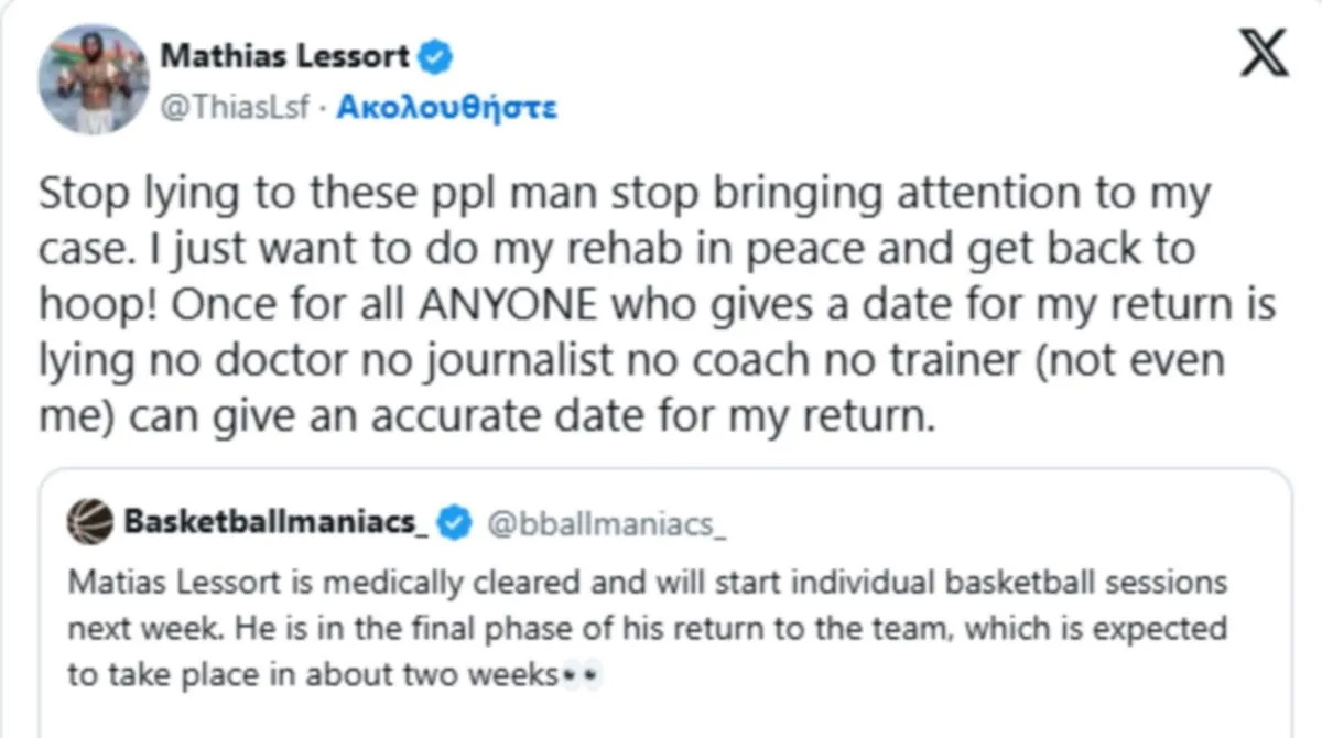 “Σταματήστε να λέτε ψέματα στον κόσμο και να δίνετε προσοχή στην περίπτωσή μου. Απλώς θέλω να συνεχίσω την αποκατάστασή μου ήρεμα και να επιστρέψω στο μπάσκετ! Μια για πάντα, ΟΠΟΙΟΣ δίνει ημερομηνία για την επιστροφή μου λέει ψέματα. Κανένας γιατρός, δημοσιογράφος, προπονητής ή γυμναστής (ούτε καν εγώ) δεν μπορεί να δώσει ακριβή ημερομηνία για την επιστροφή μου.”, αναφέρει χαρακτηριστικά η ανάρτηση Λεσόρ.