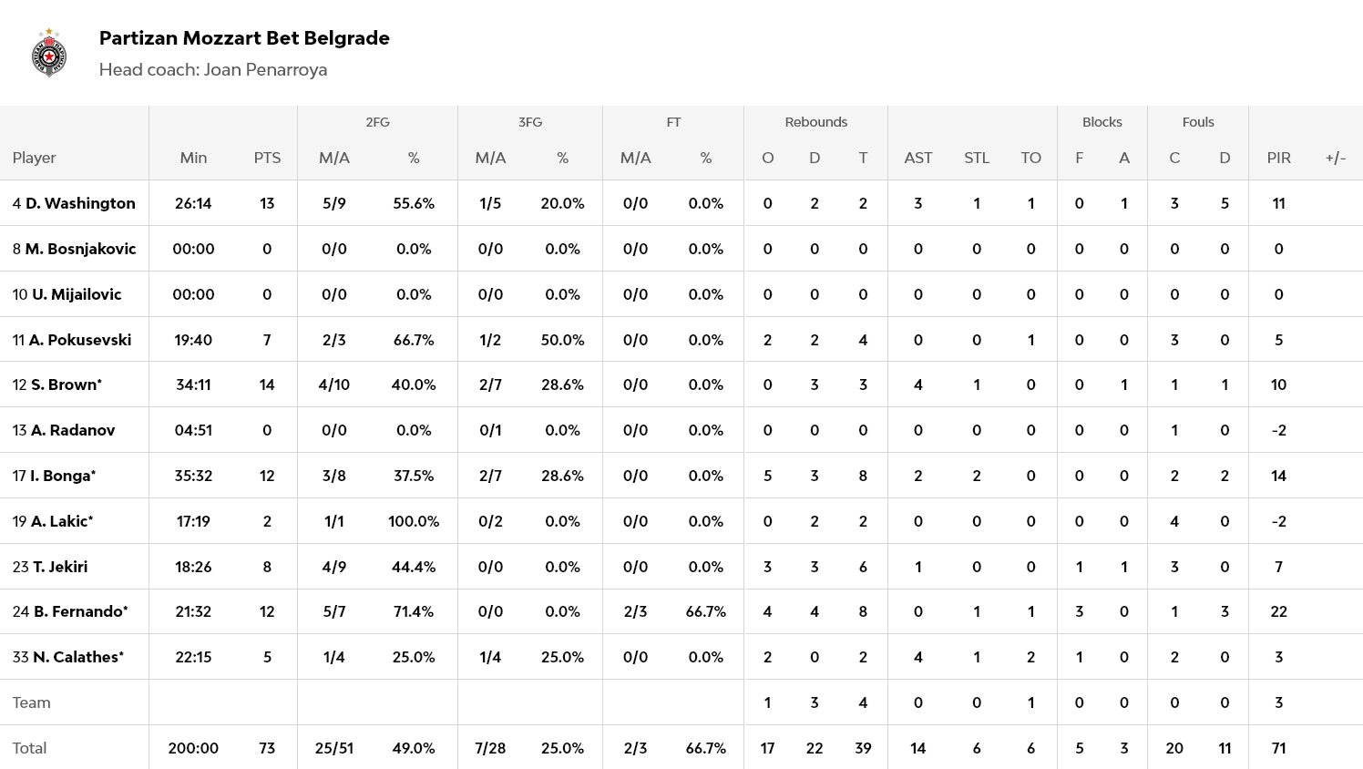 Από την Ρεάλ Μαδρίτης διακρίθηκαν οι Χεζονια και Λάιλς με 14 πόντους έκαστος. Από την Παρτιζάν ξεχώρισαν οι Μπράουν και Γουάσινγκτον με 14 και 13 πόντους αντίστοιχα.