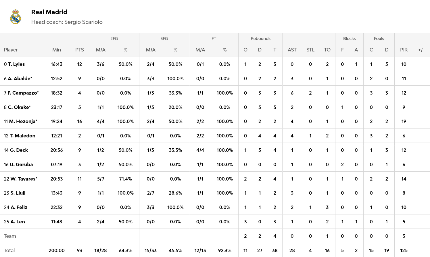Από την Ρεάλ ξεχώρισαν οι Χεζόνια και Λάιλς από 16 και 12 πόντους αντίστοιχα. Από την Μπάγερν έβαλε ο Γιεσάπ από 17 πόντους, ενώ οι Ντιμιτρίγιεβιτς και Ράταν Μέις σκόραραν από έντεκα πόντους έκαστος.