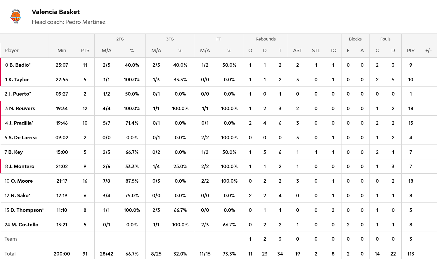 Ο Μουρ, με 16 πόντους, ήταν ο πρώτος σκόρερ των νικητών, που είχαν τον Ρίβερς στους 12, τον Μπαντιό στους 11 και τον Πραντίγια στους 10 πόντους.