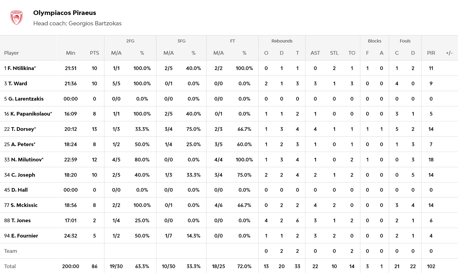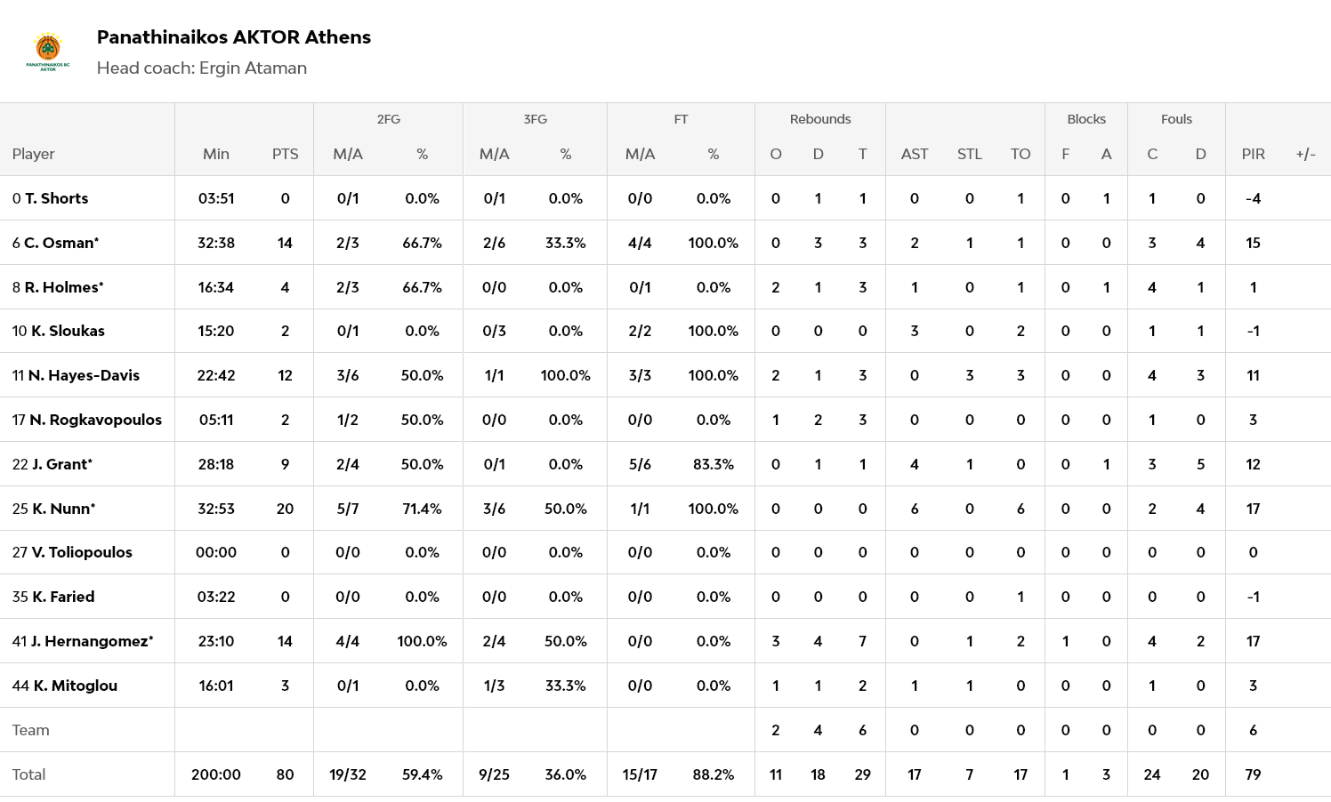 Ξεχώρισαν: 12 πόντους σημείωσε ο Μιλουτίνοβ, ενώ από 10 είχαν οι Γουόρντ, Τζόσεφ και Νιλικινά. Για τον Παναθηναϊκό, 20 πόντους, έξι ασίστ, αλλά και ισάριθμα λάθη, είχε ο Ναν, με τον Οσμάν να έχει 14 πόντους.