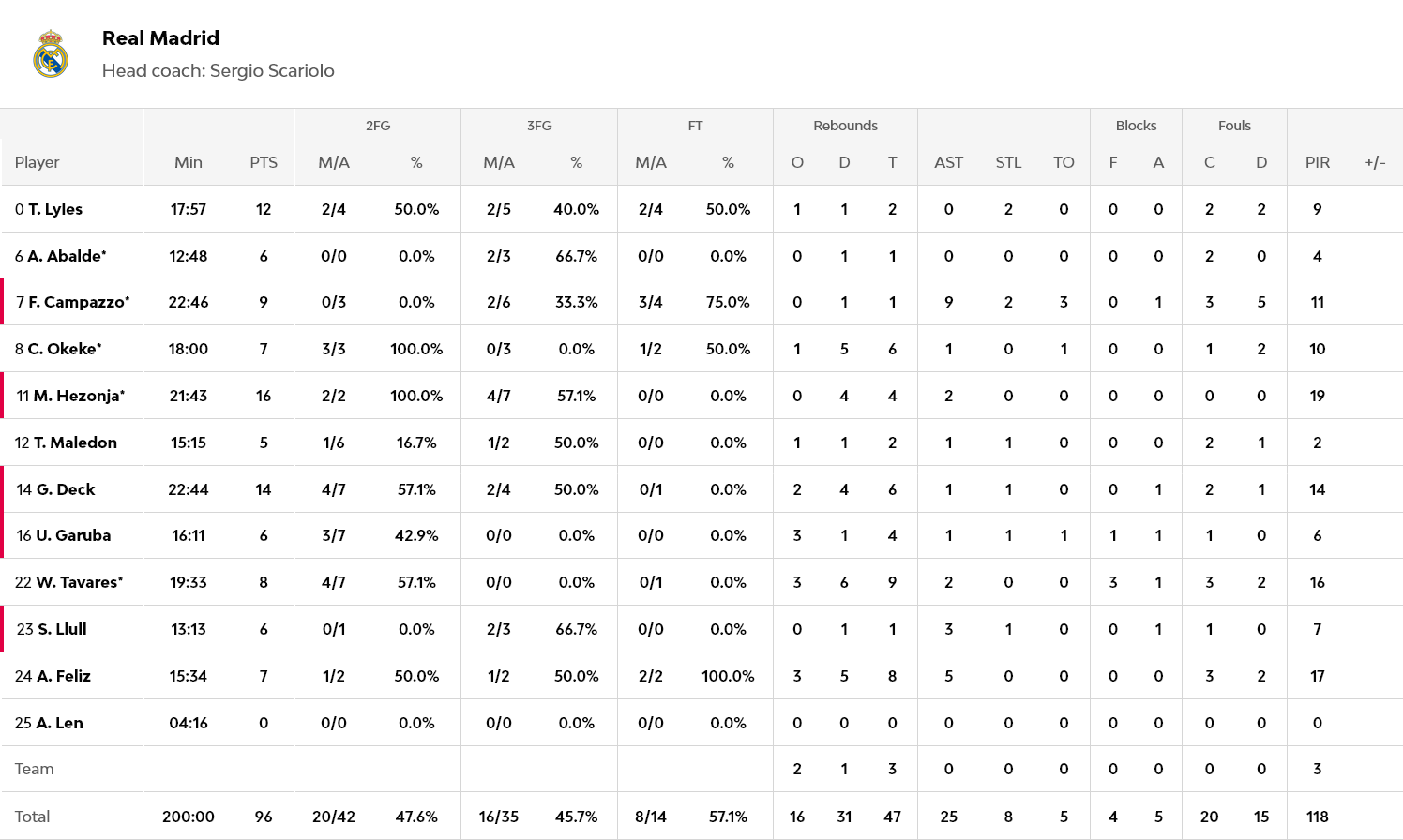 Ο Χεζόνια με 16 πόντους ήταν ο πρώτος σκόρερ της Ρεάλ, με τον Ντεκ να προσθέτει 14 και τον Λάιλς 12. Για την Βαλένθια, Μοντέρο και Πουέρτο είχαν 18 και 11 πόντους αντίστοιχα.