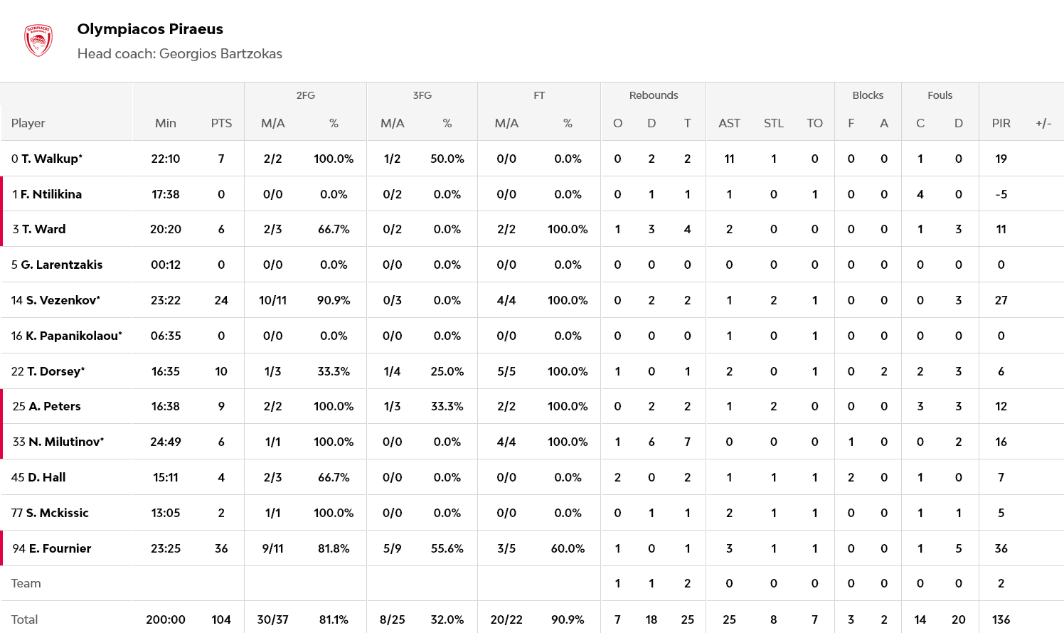 Το κρεσέντο του Χόρτον – Τάκερ συνεχίστηκε, με τον Αμερικανό, με οκτώ προσωπικούς του πόντους, να ρίχνει την διαφορά στους τρεις (78-75). Εξίσου… καυτός όμως, ήταν και ο Εβάν Φουρνιέ, που με 3+2+2 πόντους, πέτυχε το 85-77. Ο Γάλλος συνέχισε να κάνει απίστευτα πράγματα και με γκολ – φάουλ… εκτόξευσε την διαφορά στο +11 (88-77). Ο Γάλλος πέτυχε ακόμα ένα τρίποντο για το 93-81, με τον Γουόκαπ, με δικό του τρίποντο για το 96-81 να… τελειώνει το ματς. Ο Βεζένκοβ, με πέντε δικούς του πόντους… έσπασε την 100άρα (101-84), με τον Ολυμπιακό να φτάνει με θριαμβευτικό τρόπο στην νίκη με 104-87.
