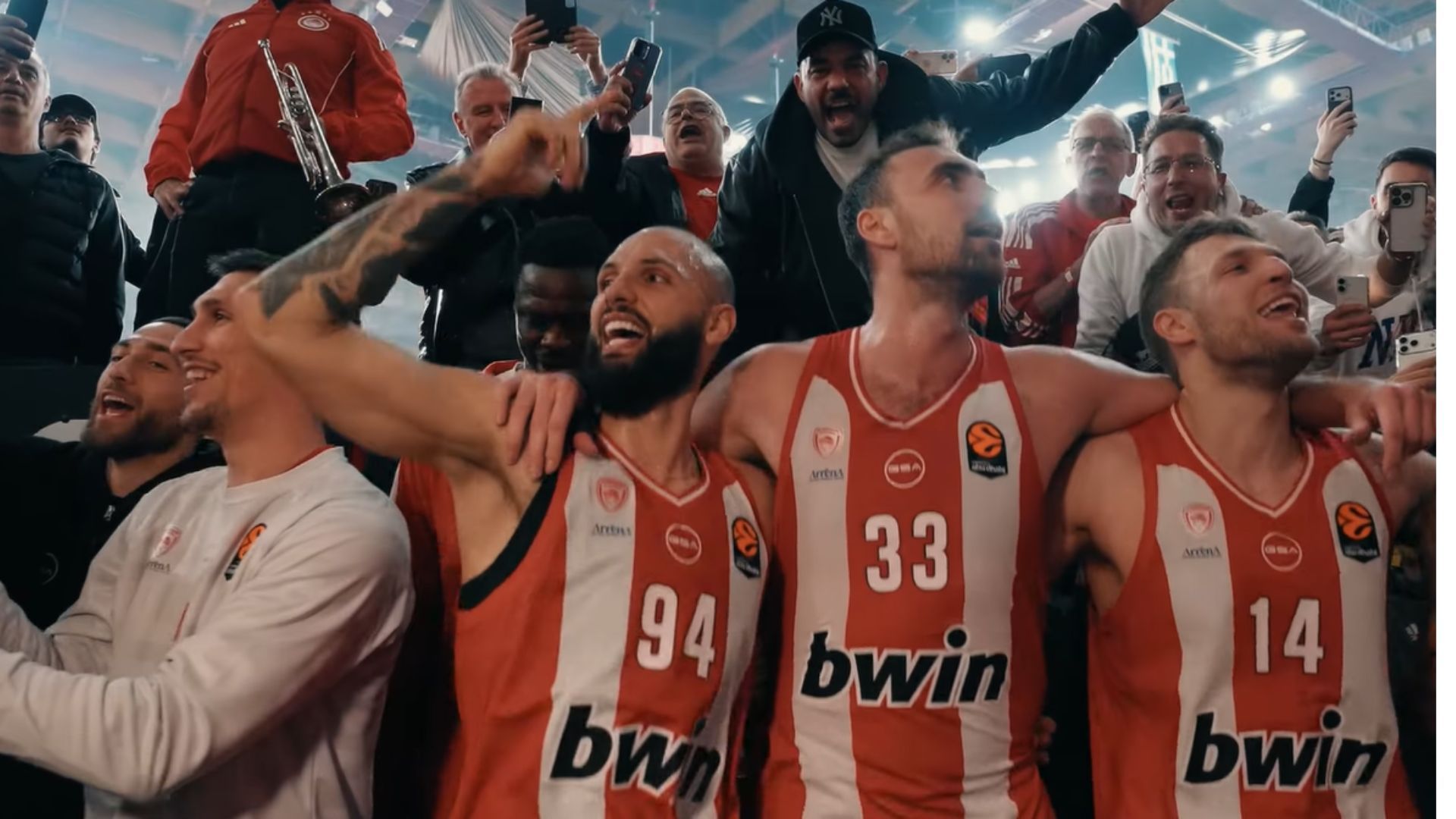Ο Ολυμπιακός πραγματοποίησε μια εξαιρετική εμφάνιση και επικράτησε στο ΣΕΦ της πρωταθλήτριας Ευρώπης Φενέρμπαχτσε, με τους παίκτες της ομάδας να γιορτάζουν τη νίκη μαζί με τον κόσμο μετά τη λήξη του αγώνα.