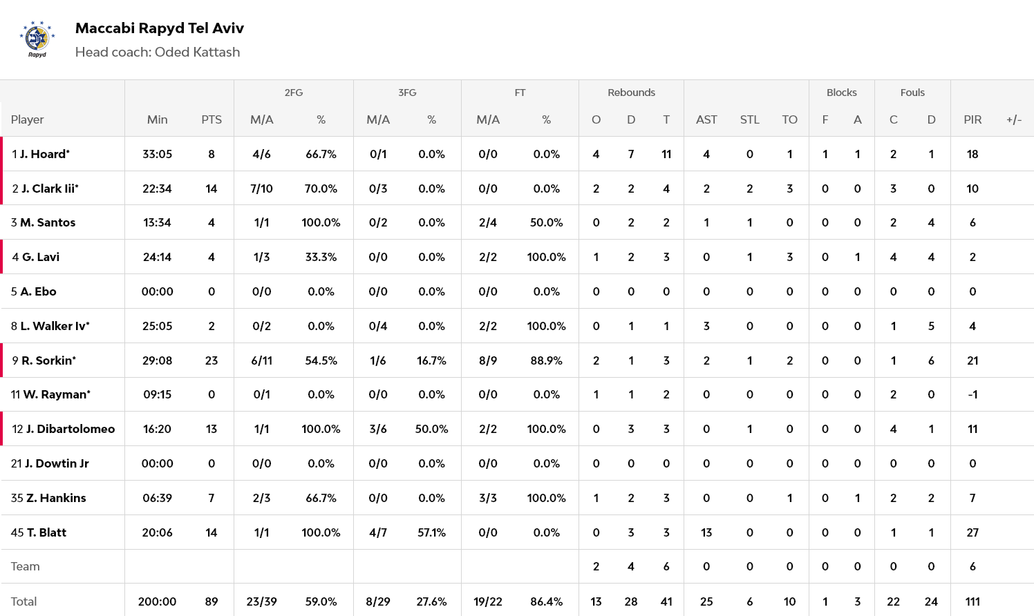 Εξαιρετική εμφάνιση από τον Σόρκιν με 23 πόντους για την Μακάμπι, που είχε τον Μπλατ με 14 πόντους και 13 ασίστ, ενώ 14 πόντους πέτυχε και ο Κλαρκ και 13 ο ΝτιΜπαρτολομέο.