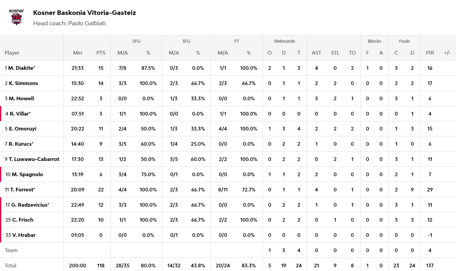 Ούτε έναν, ούτε δύο, αλλά επτά (!) παίκτες με διψήφιο αριθμό πόντων, είχε η Μπασκόνια, με τον Φόρεστ να έχει 22, τον Ντιακιτέ 15 και τον Σίμονς 14. Για την Χάποελ, 26 πόντους πέτυχε ο Μπράιαντ και 21 ο Οτούρου, ενώ ο Μπλέικνι σταμάτησε στους 19 πόντους.