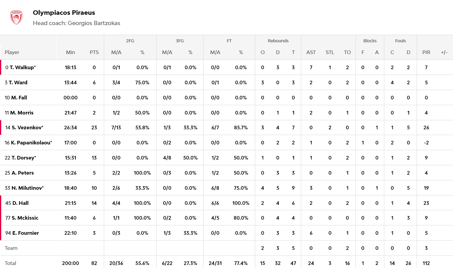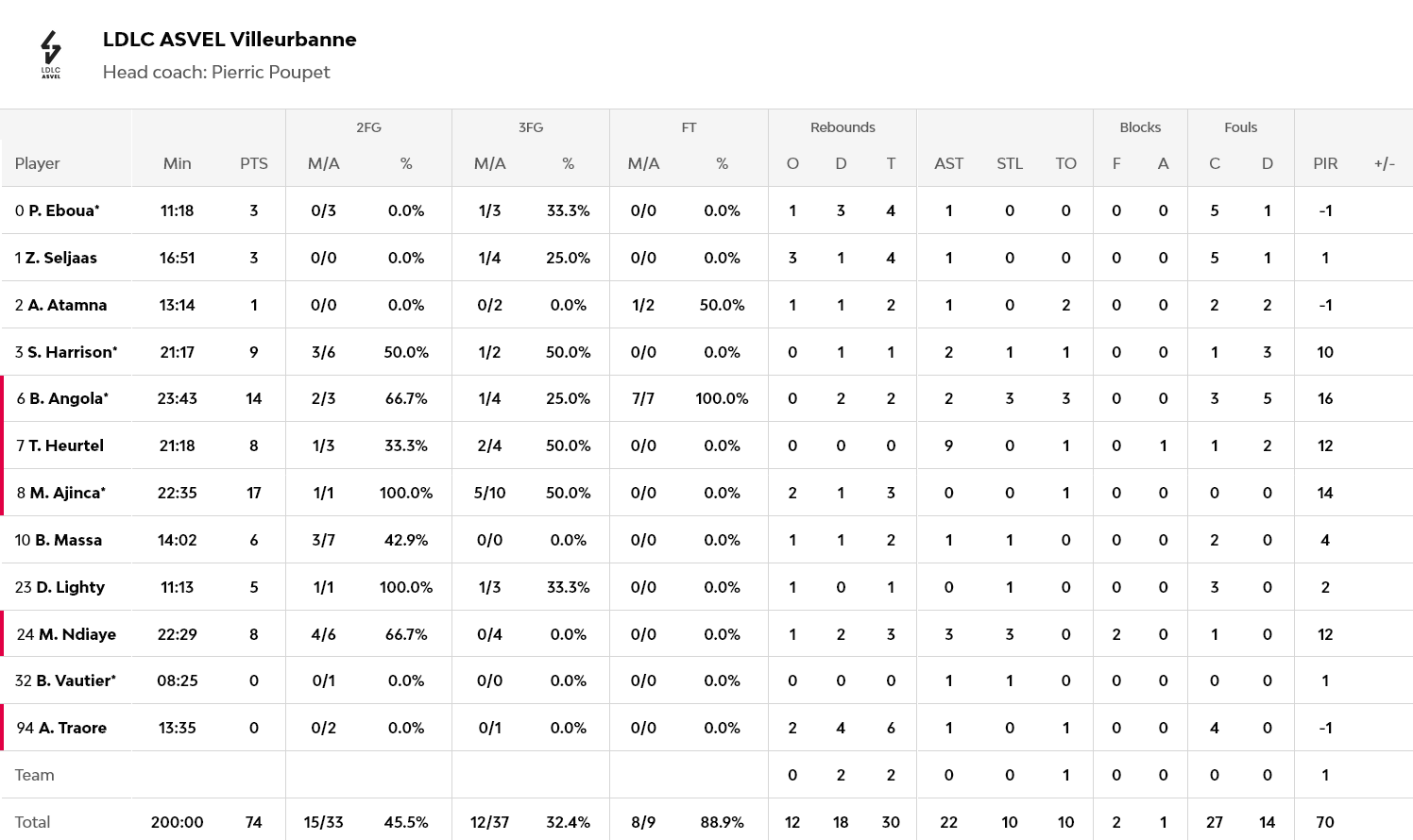 Ξεχώρισαν: Με… ελατήρια στα πόδια ο Ντόντα Χολ, με 14 πόντους και έξι ριμπάουντ, ενώ 13 πόντους είχε ο Ντόρσεϊ και 10 πόντους με εννιά ριμπάουντ ο Μιλουτίνοβ. Για την Βιλερμπάν, 17 πόντους είχε ο Αζανσά και 14 ο Αγκόλα.