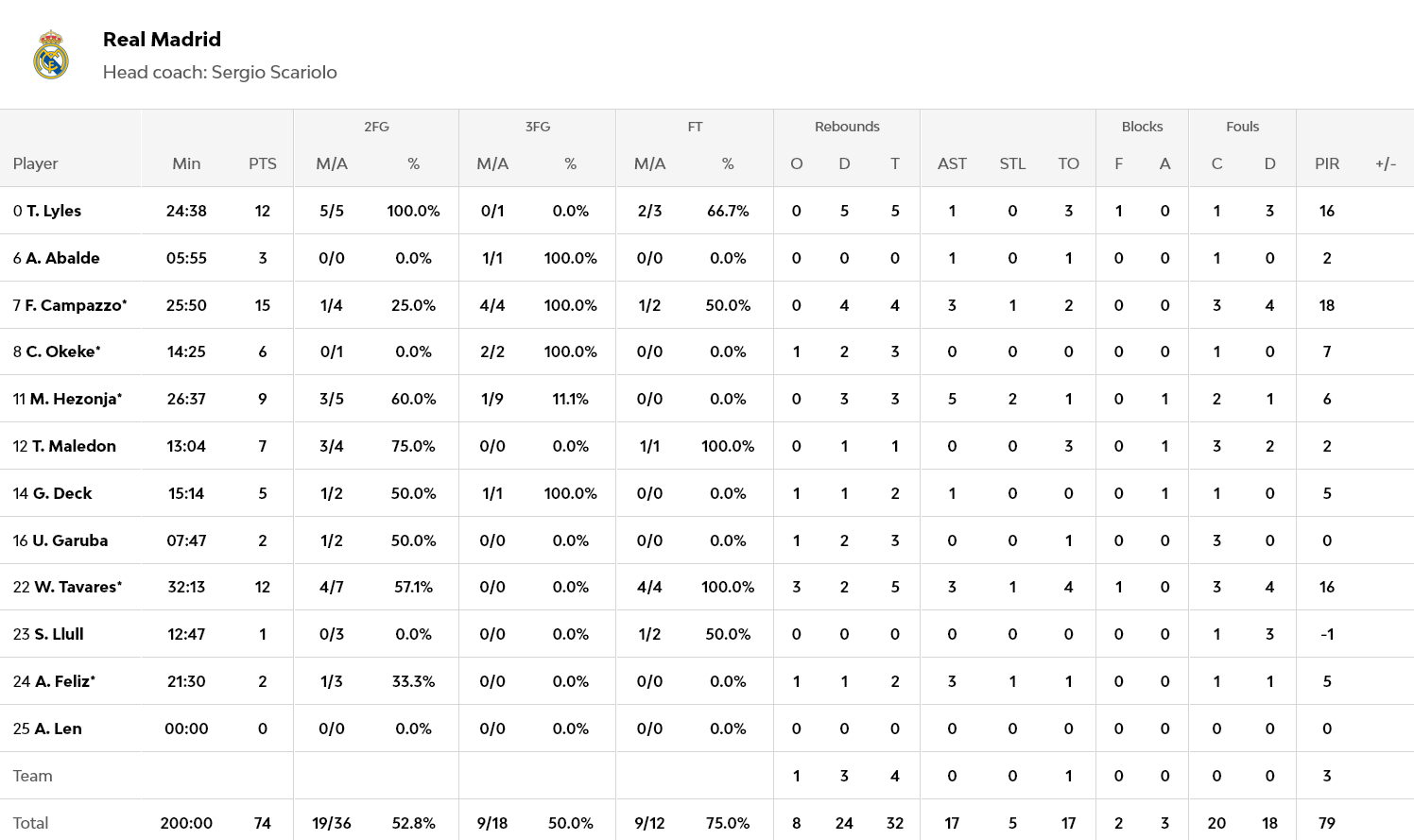 Ο Καμπάτσο με 15 πόντους ήταν ο πρώτος σκόρερ των Καστιγιάνων, με τους Λάιλς και Ταβάρες να έχουν από 12 έκαστος.