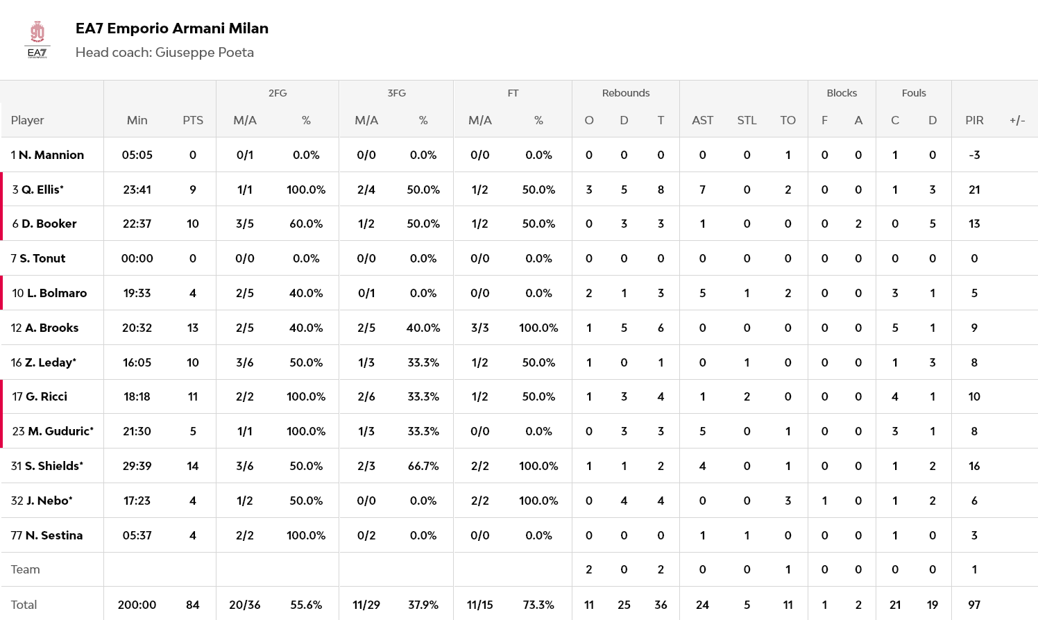 Για την Αρμάνι, ο Σιλντς είχε 14 πόντους και 13 ο Μπρουκς.