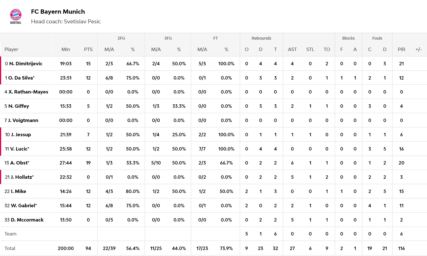 Έξι παίκτες της Μπάγερν τελείωσαν το παιχνίδι με διψήφιο αριθμό πόντων, με τον Ομπστ να έχει 19 πόντους, τον Ντιμιτρίεβιτς 15 και τους Ντα Σίλβα, Λούτσιτς, Γκάμπριελ και Μάικ από 12 έκαστος.
