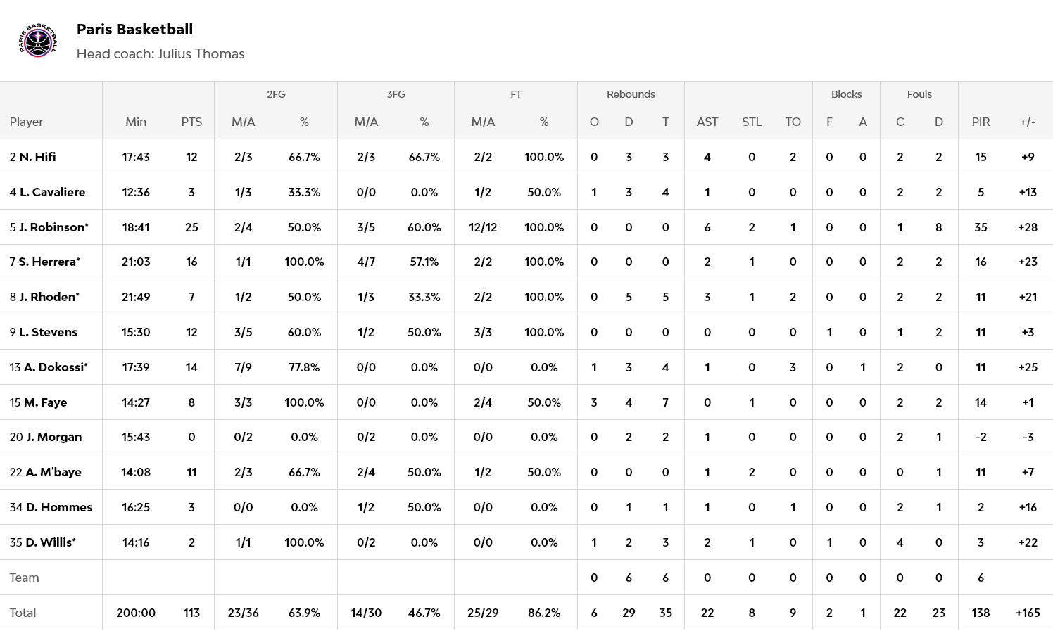 Εξαιρετική εμφάνιση από τον Ρόμπινσον με 25 πόντους και έξι ασίστ, με τον Ερέρα να ακολουθεί με 16 και τον Ντοκοσί με 14 πόντους, για την Παρί, που ανέβηκε στο 15-22.