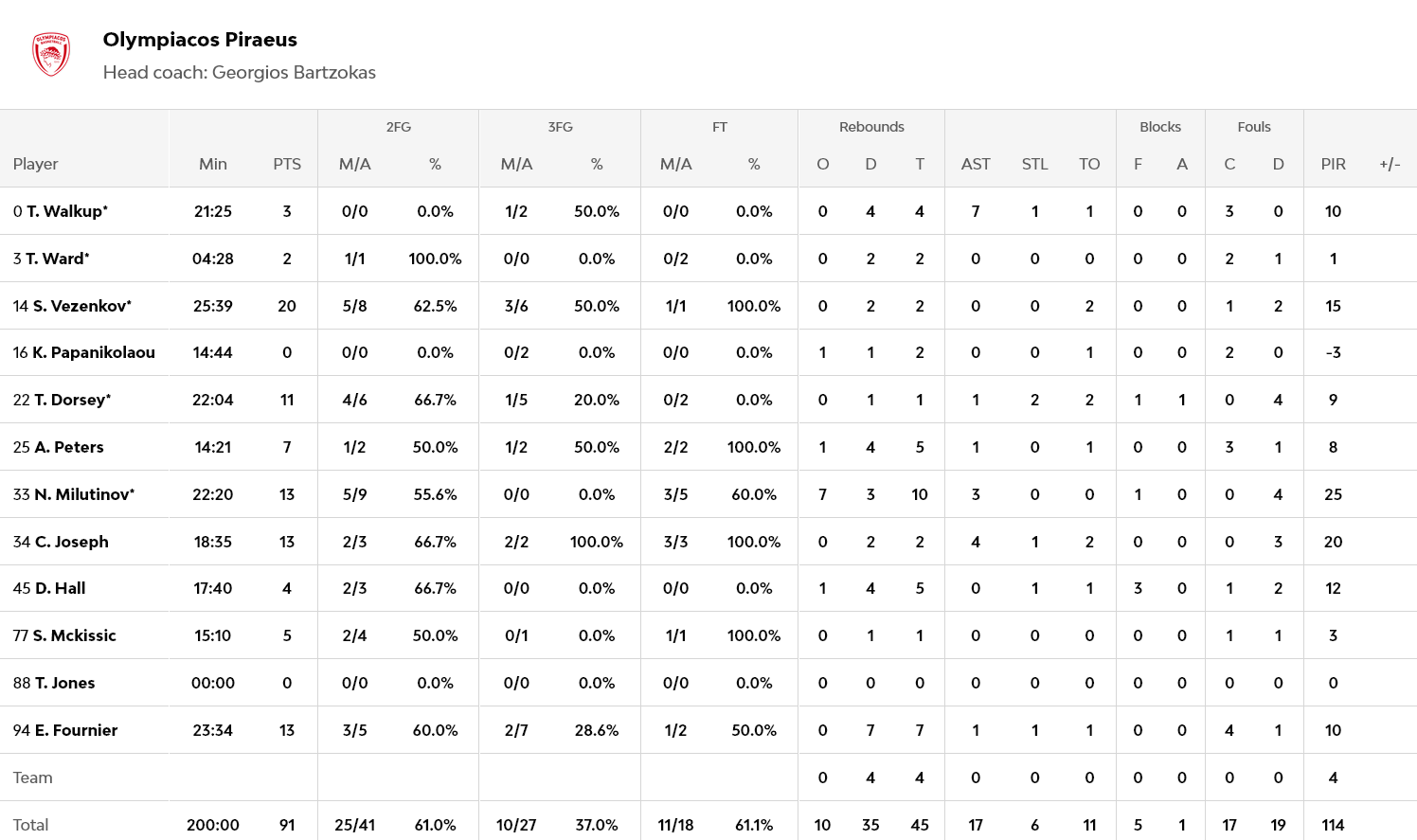 Ξεχώρισαν: Μιλουτίνοβ, με 13 πόντους και 10 ριμπάουντ, Τζόσεφ, με 13 πόντους, δύο ριμπάουντ και τέσσερις ασίστ και Φουρνιέ, με 13 πόντους και επτά ασίστ, οδήγησαν τον Ολυμπιακό στην νίκη. Για την Μονακό, ο Τζέιμς έκανε ότι μπορούσε με 19 πόντους και επτά ασίστ.