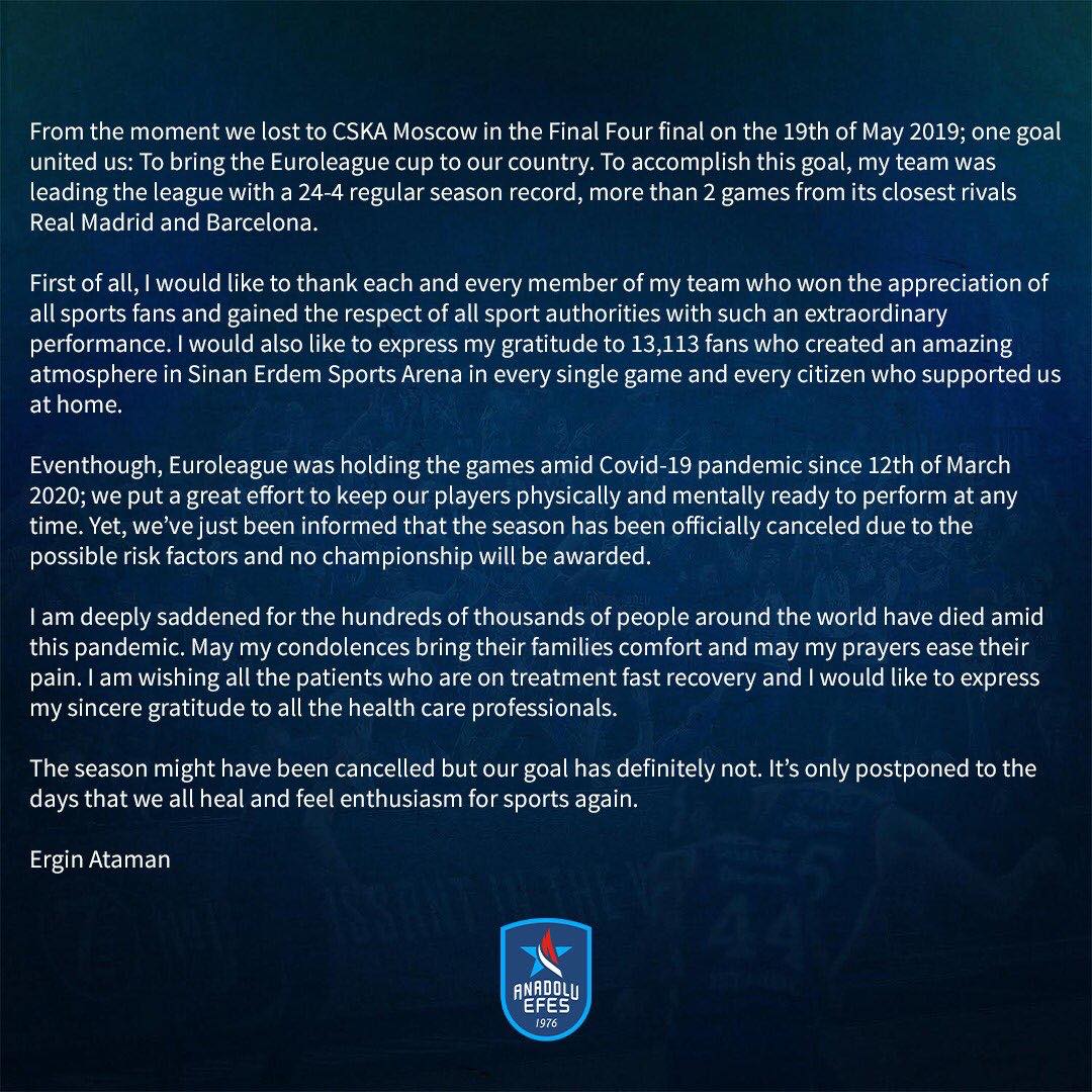 Η Εφές δημοσιοποίησε μια γραπτή ανακοίνωση του Αταμάν, με την οποία ο κόουτς ευχαρίστησε τους φιλάθλους της τουρκικής ομάδας, επεσήμανε τι έγινε στο διάστημα της καραντίνας, αλλά και επεσήμανε πως τα όνειρα για τον τίτλο, ελπίζει να εμφανιστούν ξανά σε μέρες υγείας και ενθουσιασμού.