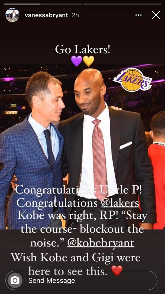 «Συγχαρητήρια θείε Π. Συγχαρητήρια Λέικερς. Ο Κόμπι είχε δίκιο. Μακάρι ο Κόμπι και η Τζίτζι να ήταν εδώ για να το δουν».