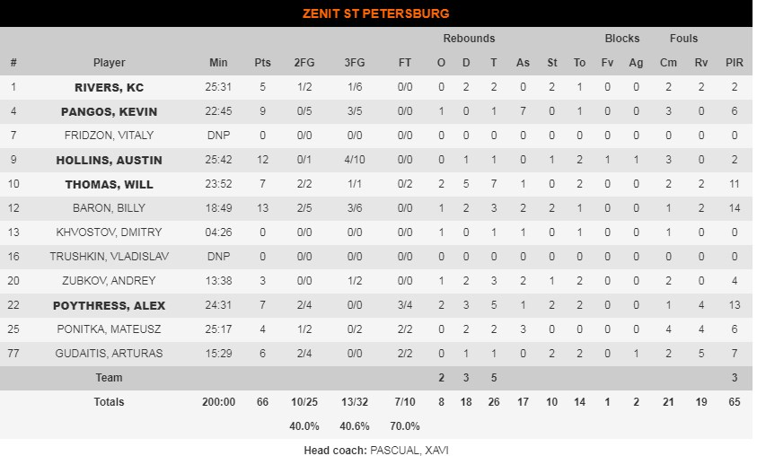 Ξεχώρισαν: Δεύτερος στη λίστα των σκόρερ ήταν ο ΜακΚίσικ με 10 πόντους, ενώ από τη μεριά της Ζενίτ ο Μπάρον μέτρησε 13 πόντους και ο Χόλινς 12 πόντους.
