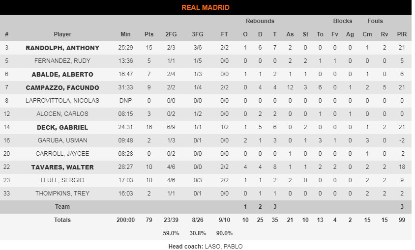 Η Ρεάλ κυριάρχησε κόντρα στη Μακάμπι (79-63) και πέτυχε την 4η διαδοχική νίκη της, ανεβάζοντας το ρεκόρ της σε 5-4. Σε πτωτική πορεία οι Ισραηλινοί, οι οποίοι υποχώρησαν στο 3-6.