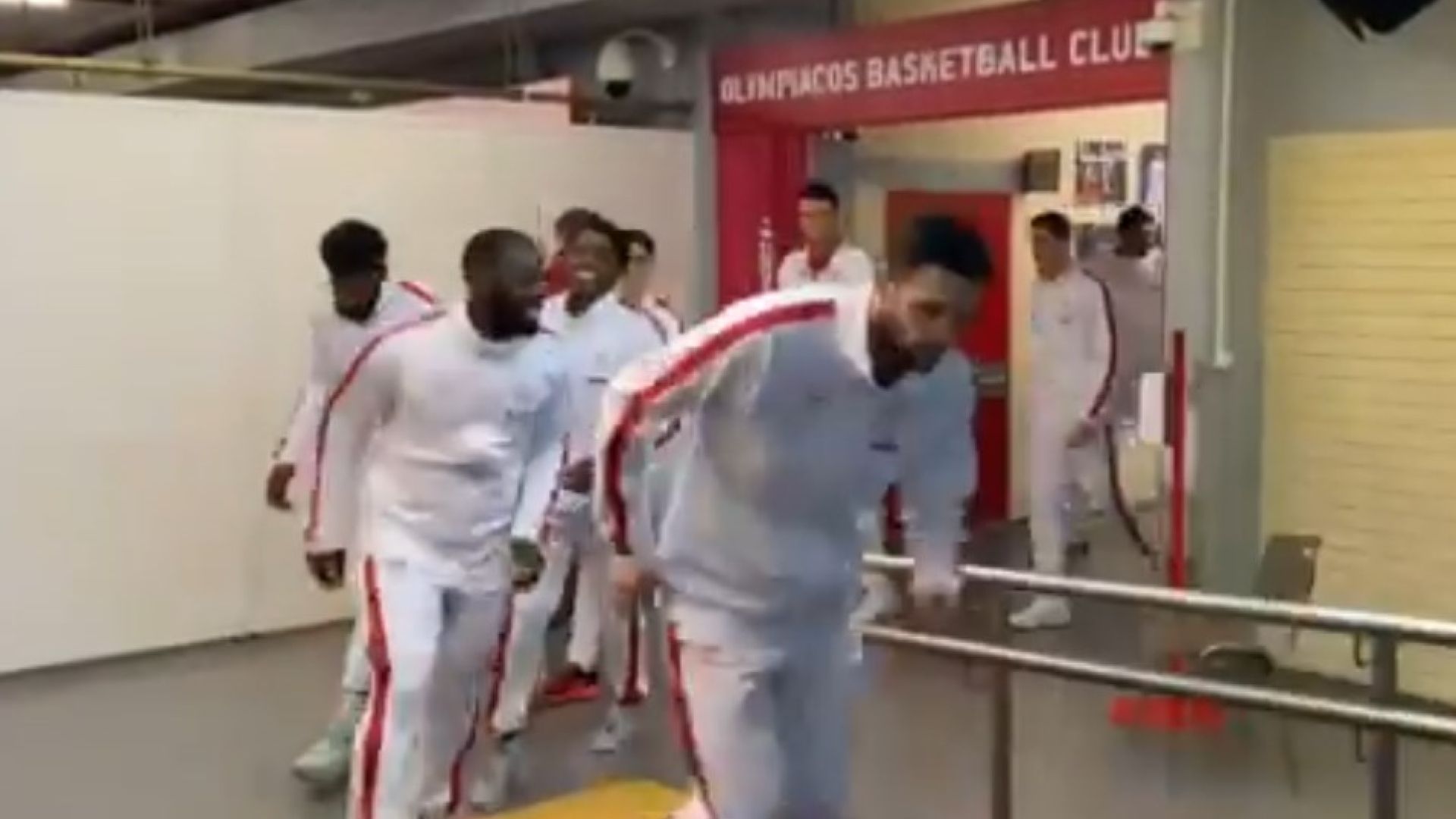 Η ομάδα του Πειραιά, βγήκε στο παρκέ για το καθιερωμένο ζέσταμα, λίγο πριν την έναρξη του αγώνα με τη Μπασκόνια (26/11, 21:00).