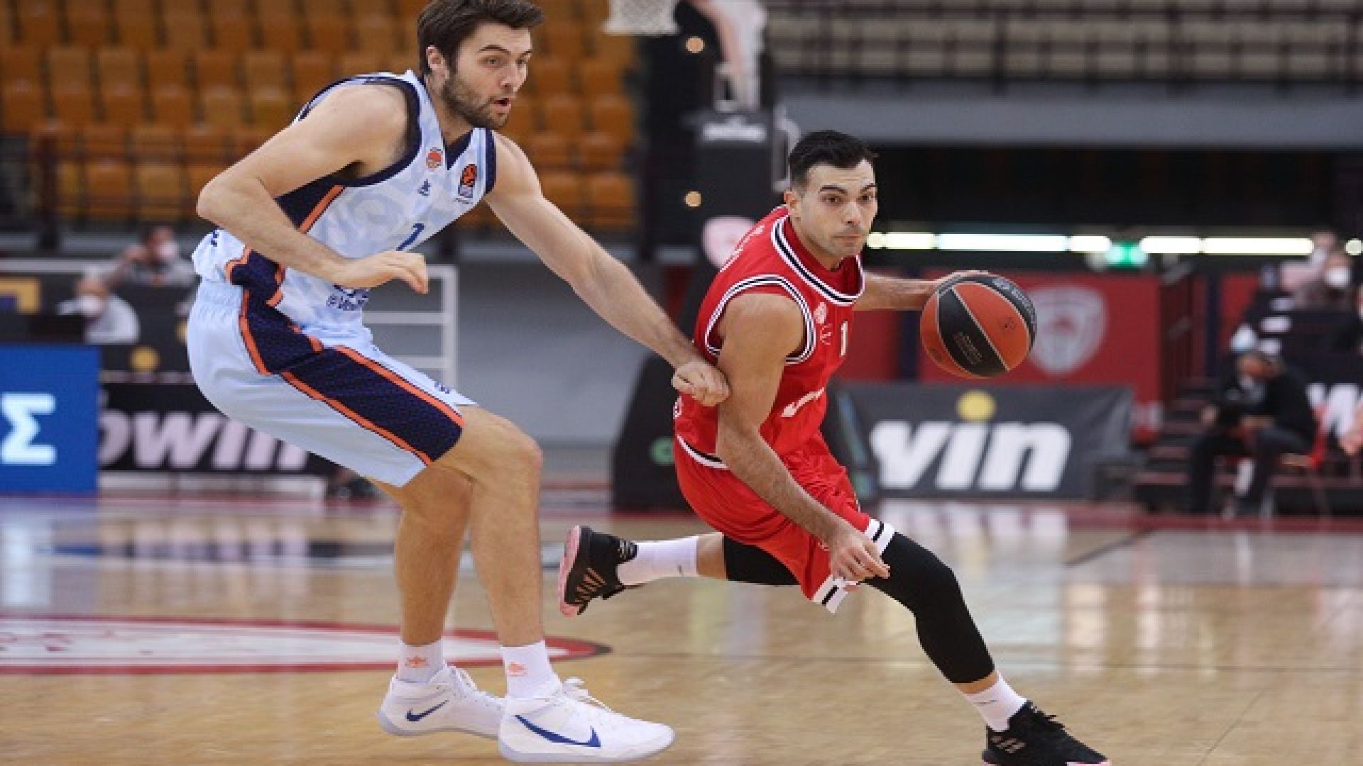 Η Βαλένθια πραγματοποίησε καλύτερο ξεκίνημα από τον Ολυμπιακό, ο οποίος είδε τον Γιώργο Πρίντεζη να αποχωρεί τραυματίας για τα αποδυτήρια, λίγο πριν το τέλος της πρώτης περιόδου. Οι νυχτερίδες έφτασαν σε διψήφια διαφορά (9-19, 8') ενώ στη συνέχεια βρέθηκαν μέχρι και στο +14 (36-50, 19'), αφήνοντας τους ερυθρόλευκους σε ρόλο κυνηγού (39-52, 20').