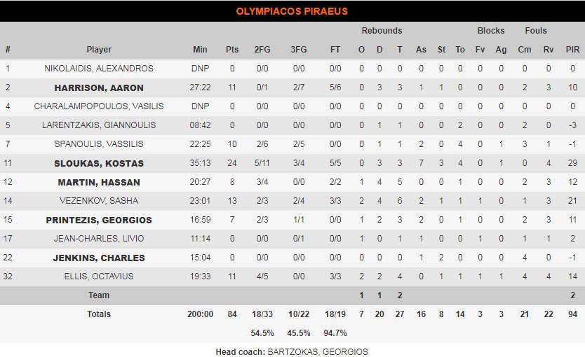 Ξεχώρισαν: Από τους νικητές ο Βεζένκοφ μέτρησε 13 πόντους, 6 ριμπάουντ και 2 ασίστ, οι Έλις και Χάρισον μέτρησαν από 11 πόντους έκαστος και ο Σπανούλης μέτρησε 10 πόντους. Από τη μεριά των ηττημένων,ο Σίλεϊ σημείωσε 26 πόντους και ο Ρέινολντς 20 πόντους.