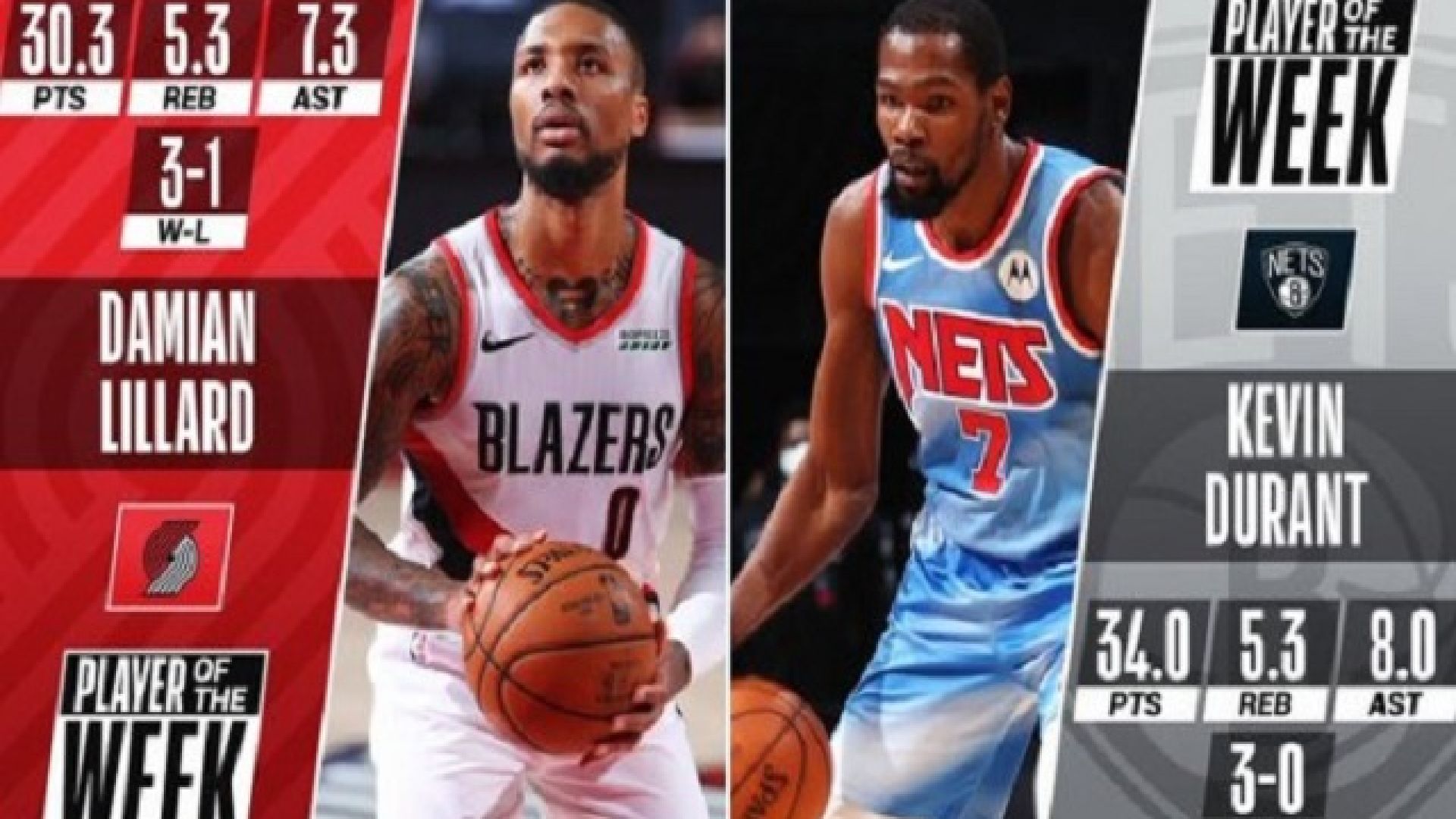 Oι Κέβιν Ντουράντ και Ντάμιαν Λίλαρντ είναι οι παίκτες της εβδομάδας του ΝΒΑ.