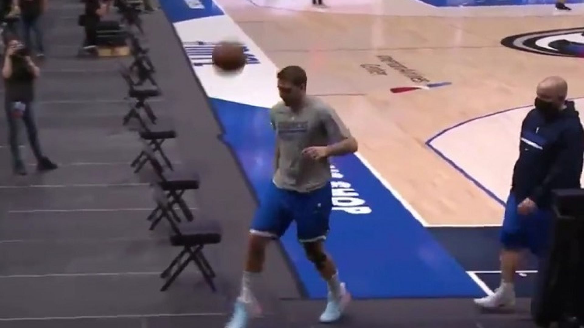 Στο ζέσταμα των Μάβερικς, ο σταρ της ομάδας του Ντάλας ξεκίνησε να κάνει ποδοσφαιρικά κόλπα με τη μπάλα και στη συνέχεια έπιασε τη μπάλα για να ευστοχήσει μακριά από το καλάθι.