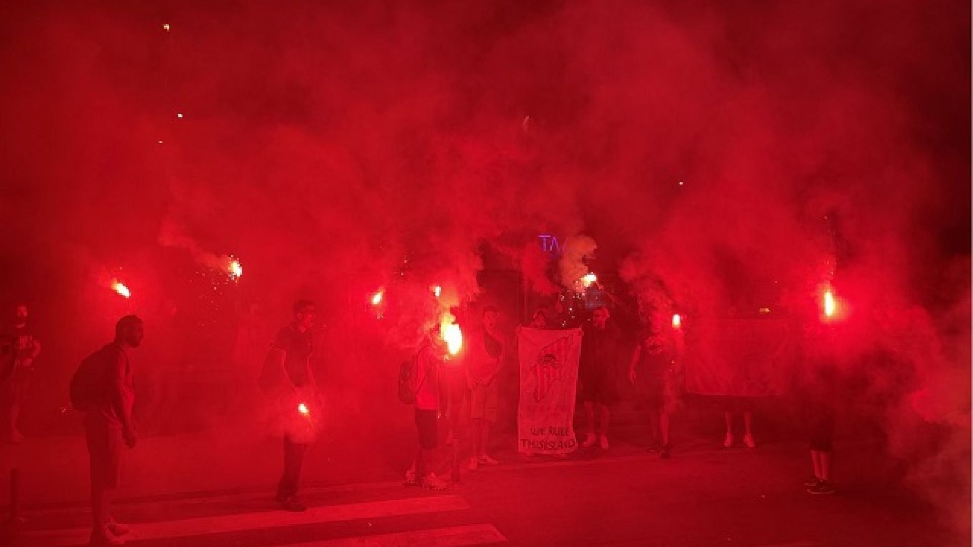 Συγκεκριμένα, περίπου 50 φίλοι της ομάδας του Πειραιά υποδέχθηκαν τους ερυθρόλευκους με συνθήματα και φωτοβολίδες το βράδυ της Παρασκευής (17/9).