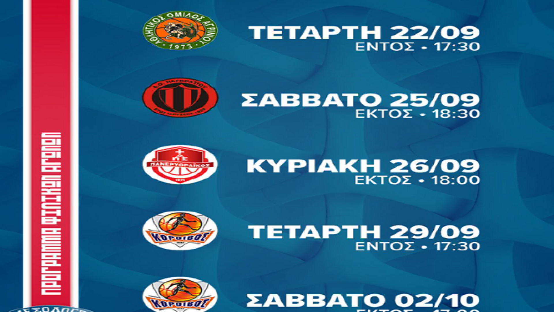 Οι δύο εντός έδρας αγώνες (22.09 με Αγρίνιο & 29.09 με Κόροιβο) θα είναι ανοικτές για το κοινό.