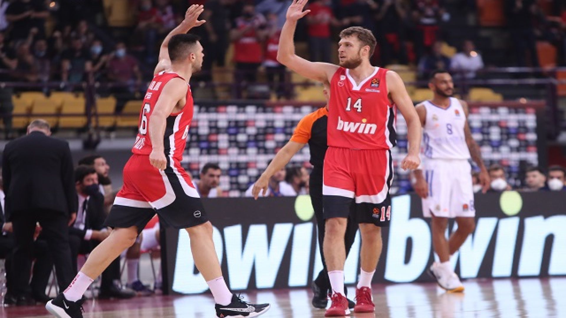 Οι δύο ομάδες ξεκίνησαν χέρι-χέρι την αναμέτρηση, ωστόσο ο Ολυμπιακός ήταν εκείνος που κατάφερε να βρεθεί σε θέση οδηγού, χάρη στον Σάσα Βεζένκοφ ο οποίος με ένα δίποντο και μία εύστοχη βολή λίγο αργότερα, κατάφερε να δώσει προβάδισμα 5 πόντων στους ερυθρόλευκους (13-8, 8'). Η Ρεάλ από τη μεριά της δεν έβρισκε λύσεις επιθετικά (όπως στην αναμέτρηση απέναντι στην Εφές), ωστόσο πίεζε συνεχώς τους γηπεδούχους και με μία προσπάθεια του Γιουλ μείωσε στο τέλος του πρώτου δεκαλέπτου (13-10, 10'). Διαφορετική ήταν η εικόνα του ματς στη δεύτερη περίοδο, αφού οι δύο πλευρές ανέβασαν «στροφές». Οι παίκτες του Μπαρτζώκα έφτασαν εκ νέου στο +6 (19-13, 12') διατήρησαν στη μεγαλύτερη διάρκεια της περιόδου το προβάδισμα.