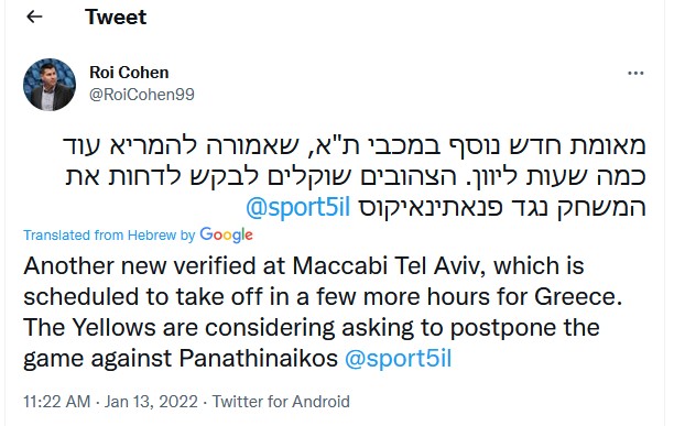 Μάλιστα, σύμφωνα με τον γνωστό δημοσιογράφο, Ρόι Κοέν, οι ιθύνοντες της Μακάμπι σκέφτονται να ζητήσουν από την Euroleague, την αναβολή της αναμέτρησης του ΟΑΚΑ απέναντι στον Παναθηναϊκό, για την 21η αγωνιστική, η οποία είναι προγραμματισμένη για το βράδυ της Παρασκευής (14/1, 21:00).