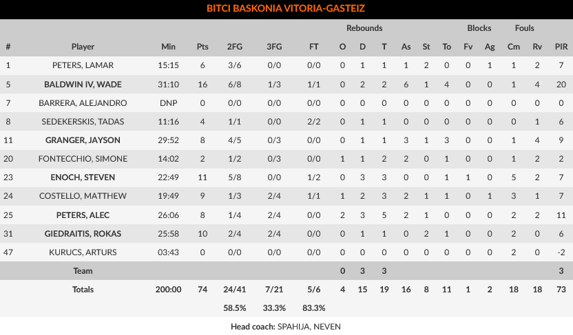 Για την Μπασκόνια, ο Μπόλντγουιν είχε 16 πόντους και έξι ασίστ, με τον Ενοχ να έχει 11 πόντους και τον Γκεντράιτις 10.