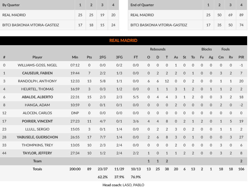 Ο Γιαμπουσελέ με 17 πόντους και οκτώ ριμπάουντ, ήταν ο κορυφαίος των Καστιγιάνων, με τον Αμπάλδε να έχει 15 πόντους και τον Ράντολφ να κάνει ένα εντυπωσιακό double – double με 13 πόντους και 12 ριμπάουντ, με την Ρεάλ να έχει έξι παίκτες με διψήφιο αριθμό πόντων.