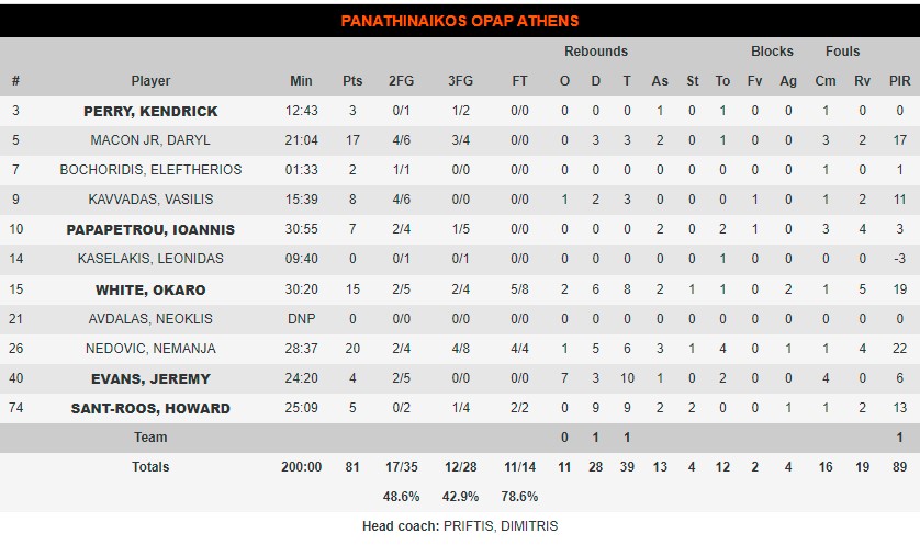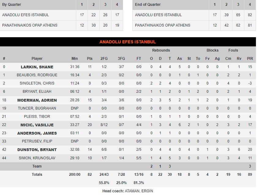 Ξεχώρισαν: Ο Μέικον με 15 πόντους και ο Νέντοβιτς με 20 . Για τους Τούρκους, ο Ντάνστον με 14 πόντους και ο Μόερμαν με 15 και το τρίποντο της νίκης