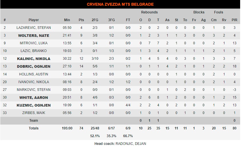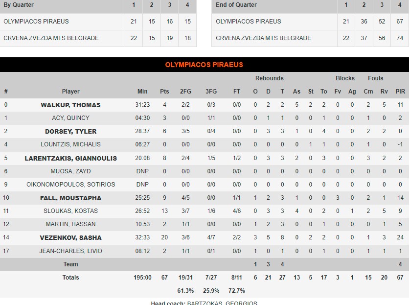 Ξεχώρισαν: Ο Ντόμπριτς με 14 πόντους και ο Γουόλτερς με 9. Για τον Ολυμπιακό κορυφαίος ο Βεζένκοφ με 20 πόντους.
