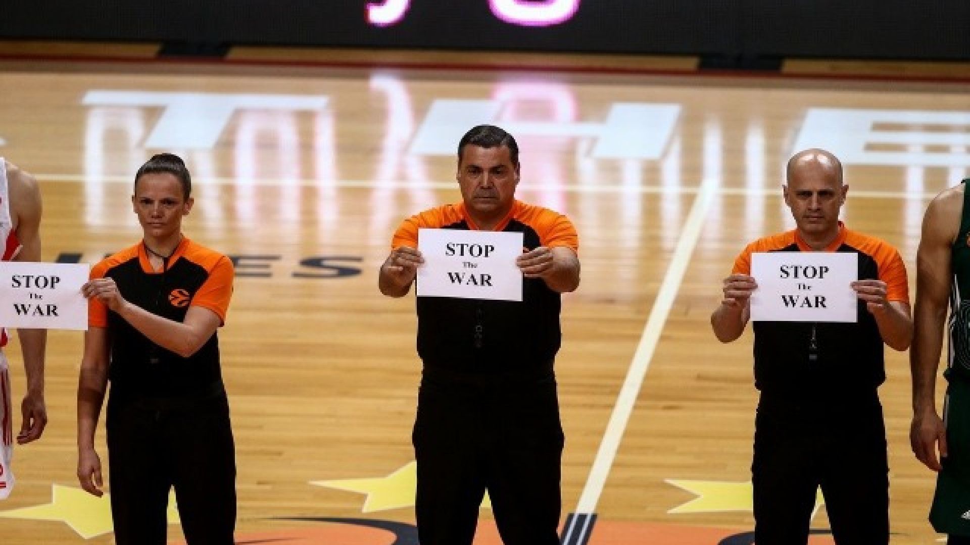 Μετά τον Ουκρανό διαιτητή Μπόρις Ρίζικ στον αγώνα του Ολυμπιακού με την Αρμάνι Μιλάνο και οι διαιτητές του Παναθηναικός-Ερυθρός Αστέρας, Ντάνιελ Ιερεθουέλο, Άννε Πάντερ και Σέγι Σέμες έστειλαν μήνυμα κατά του πολέμου, κρατώντας μια λευκή σελίδα, αναφέροντας την φράση: «Σταματήστε τον πόλεμο».