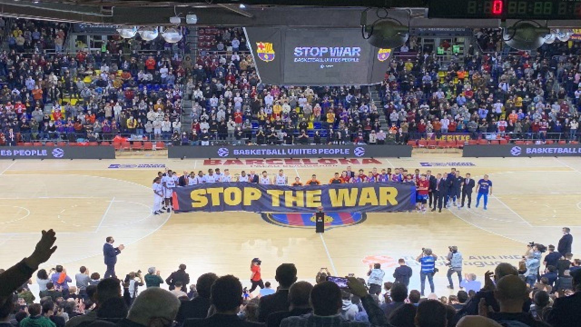 Ένα πολύ μεγάλο πανό, το οποίο έγραφε "σταματήστε τον πόλεμο" σήκωσαν οι παίκτες, οι ανθρώποι του σταφ, οι προπονητές και οι διαιτητές λίγο πριν την έναρξη του αγώνα ανάμεσα στην Μπαρτσελόνα και στην Μονακό στο γήπεδο Παλάου Μπλαουγκράνα, για την 28η αγωνιστική της EuroLeague και έκαναν σαφή έκκληση για ειρήνη στην περιοχή της Ουκρανίας που επικρατεί εμπόλεμη κατάσταση.