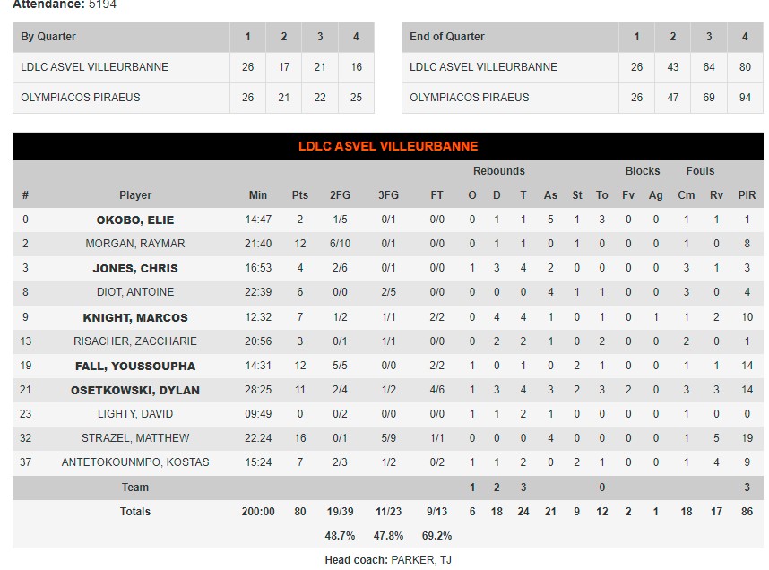 Ξεχώρισαν: Ο Σλούκας με 15 πόντους και 9 ασίστ και ο Βεζένκοβ με 18 πόντους και 10 ριμπάουντ για τον Ολυμπιακό. Για τη Βιλερμπάν, πρώτος σκόρερ ο Στράζελ με 16 πόντους.