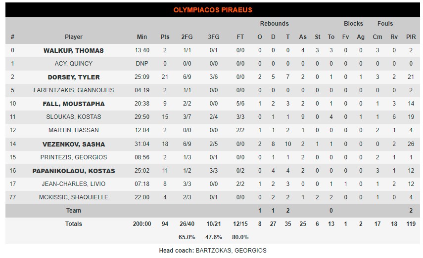 Η μεγαλύτερη διαφορά: +14 (80-94) για τον Ολυμπιακό.