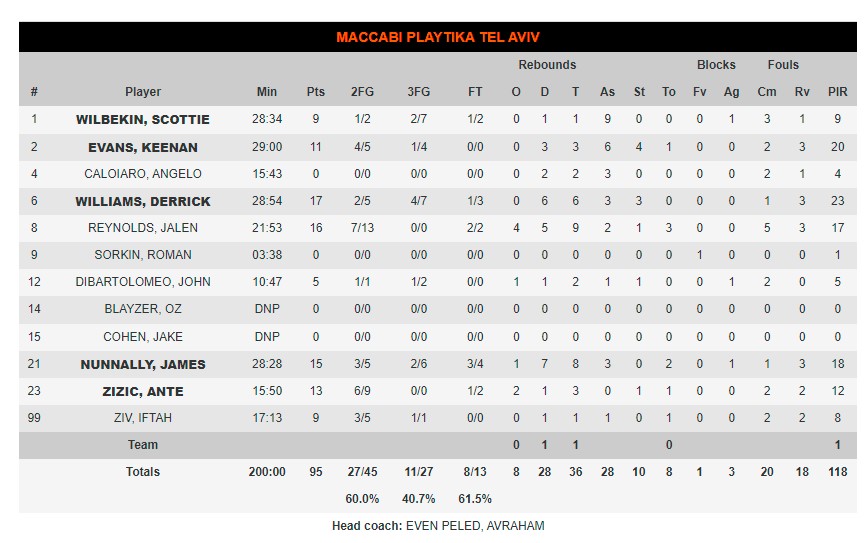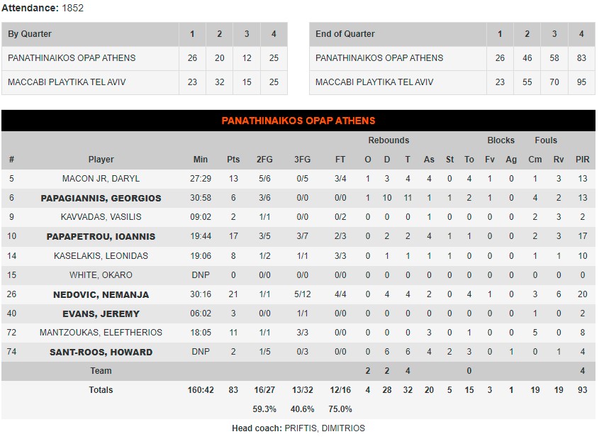 Ξεχώρισαν: Για τον Παναθηναϊκό οι Νέντοβιτς και Παπαπέτρου με 21 π. και 17 π. αντίστοιχα. Για τη Μακάμπι, ο Νάναλι με 15 π. και ο Ρέινολντς με 16 π.