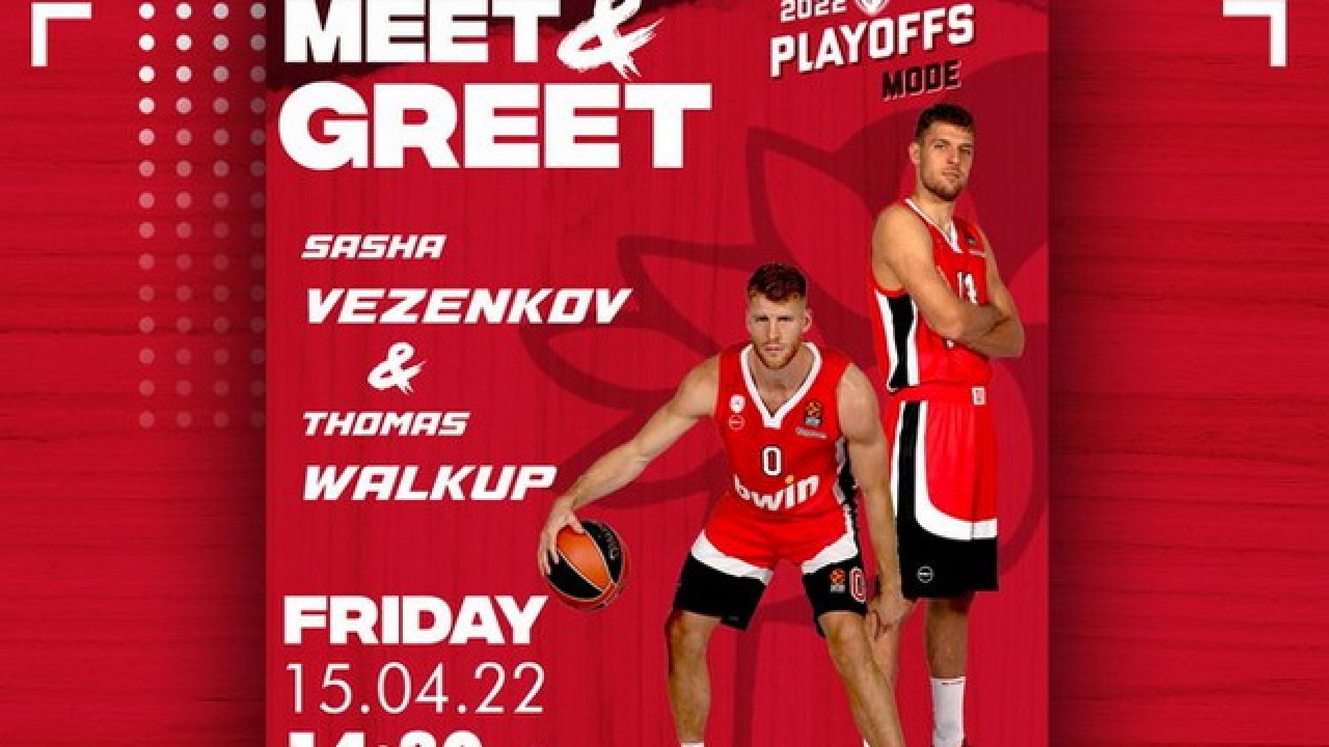 Έτσι, ενόψει και των αναμετρήσεων με την Μονακό (20-22/4), ο Σάσα Βεζένκοβ και ο Τόμας Γουόκαπ θα περιμένουν το μεσημέρι της Παρασκευής (15/4, 14:30) τους φίλους του Ολυμπιακού στην Πλατεία Κοραή, προκειμένου να συζητήσουν μαζί τους, να δώσουν αυτόγραφα και να βγάλουν φωτογραφίες.