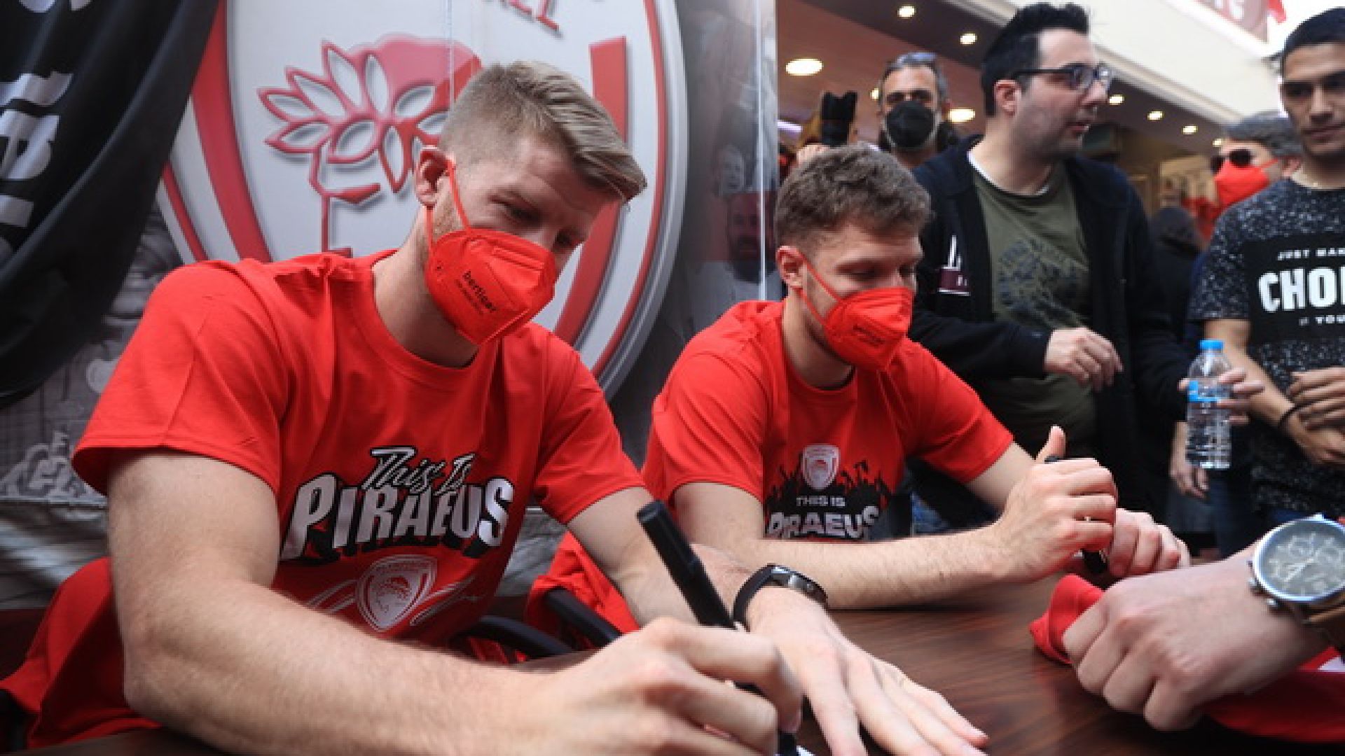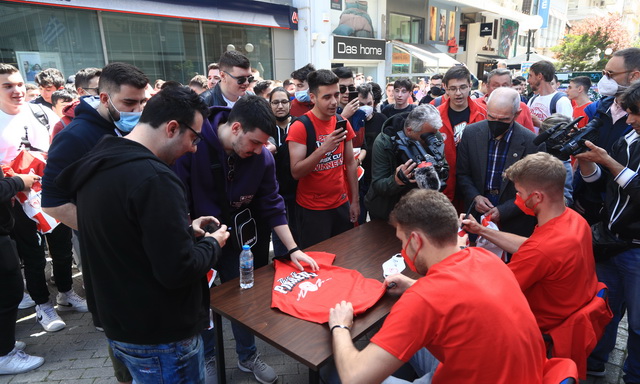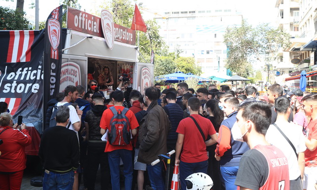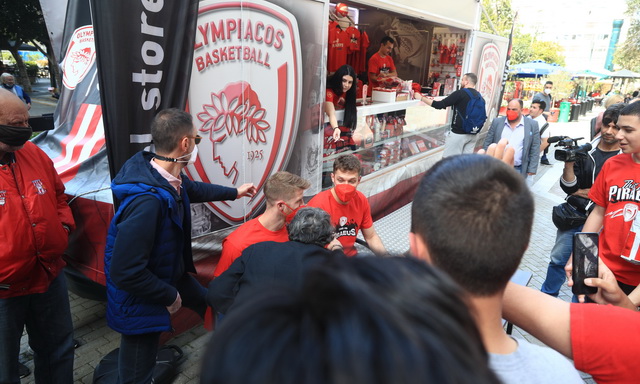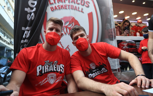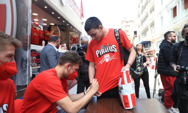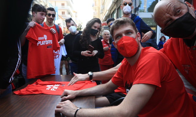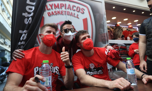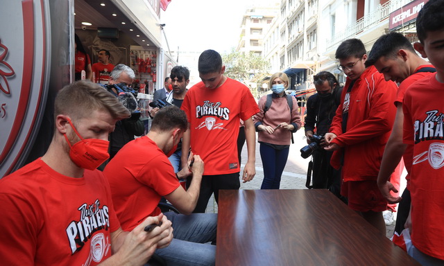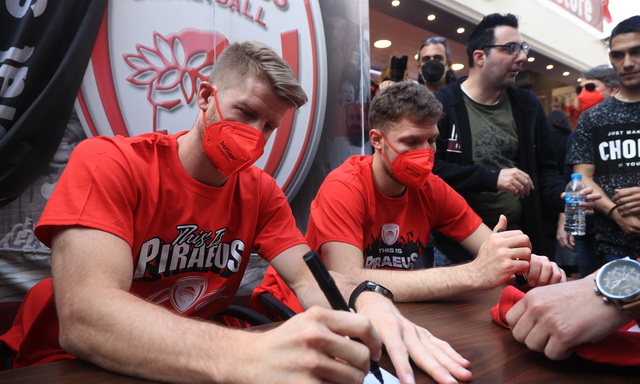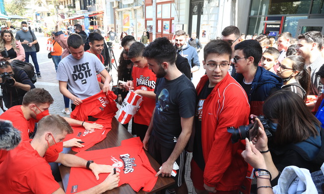 Πλήθος κόσμου βρέθηκε στην Πλατεία Κοραή, στο κέντρο του Πειραιά, για να δει από κοντά τους Σάσα Βεζένκοβ και Τόμας Γουόκαπ, στο “Meet and Greet» που διοργάνωσε η ΚΑΕ Ολυμπιακός, ενόψει και των αγώνων με την Μονακό, για τα Play Offs της Euroleague.