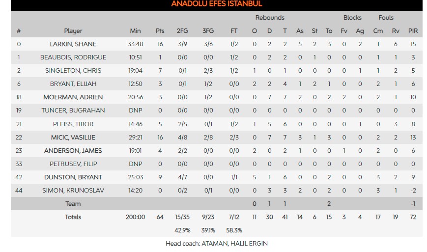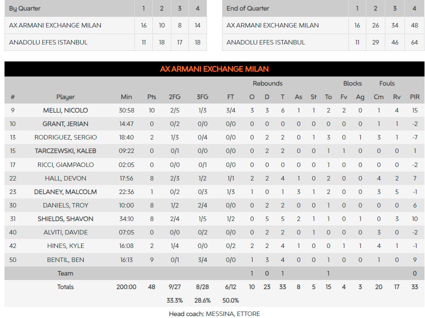Ξεχώρισαν για την Εφές, οι Λάρκιν και Μίσιτς με 16 πόντους αμφότεροι και για το Μιλάνο ο Μέλι με 10 πόντους.