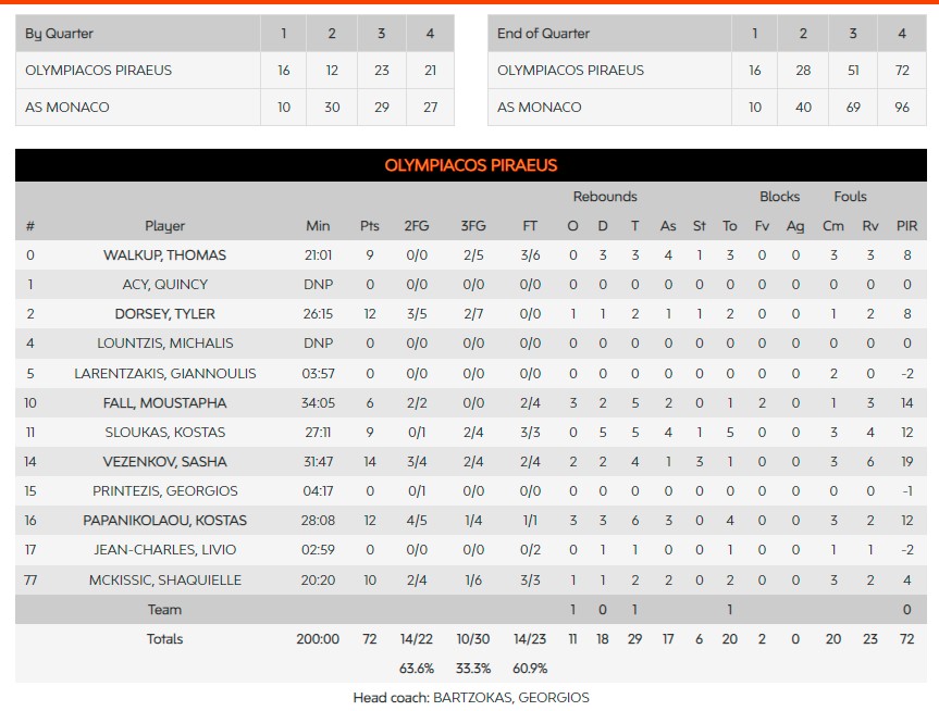 Ξεχώρισαν: Ο Βεζένκοφ με 14 πόντους για τον Ολυμπιακό και ο Άντουσιτς με 19 πόντους για τη Μονακό.