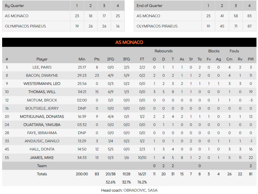 Ξεχώρισαν: Για τον Ολυμπιακό ο Βεζένκοφ με 17 πόντους και ο Γουόκαπ, που πέρασε… χειροπέδες στον Τζέιμς . Για τη Μονακό ο Μπέικον με 23 πόντους, που πήγε να γυρίσει σχεδόν μόνος του το ματς.
