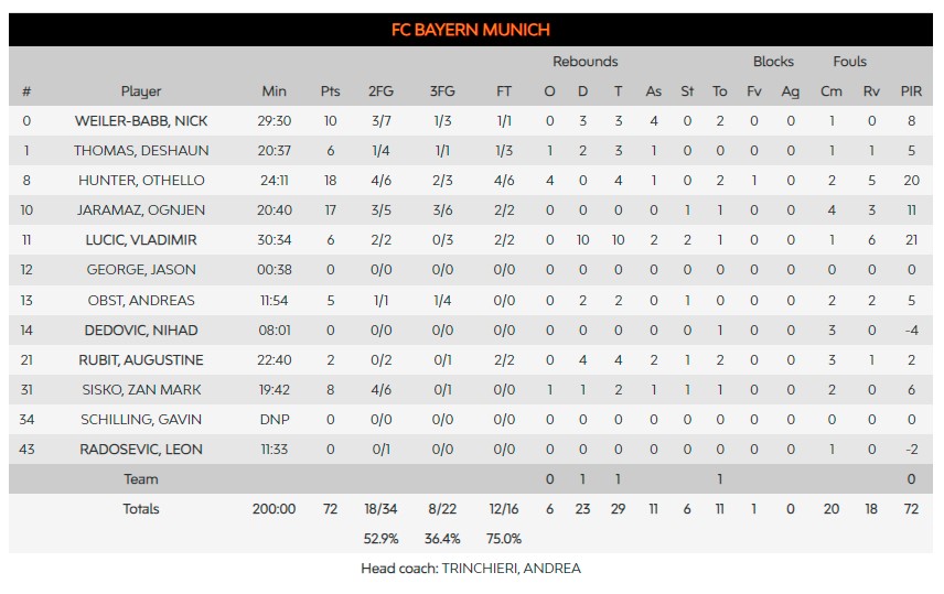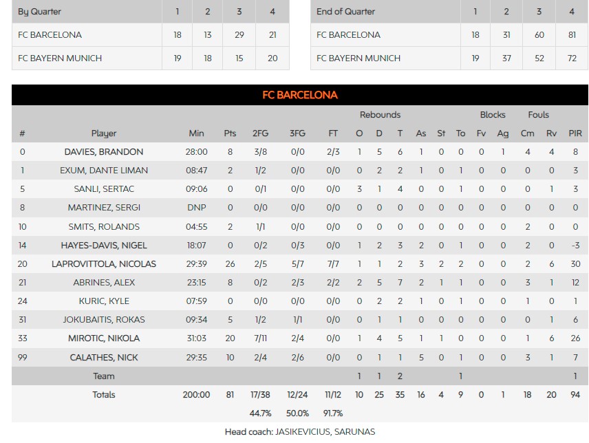 Ξεχώρισαν για τη Μπαρτσελόνα ο Λαπροβίτολα με 26 πόντους (5/7τρ) και για τη Μπάγερν ο Χάντερ με 18 πόντους (2/3τρ).