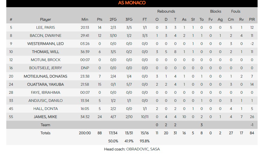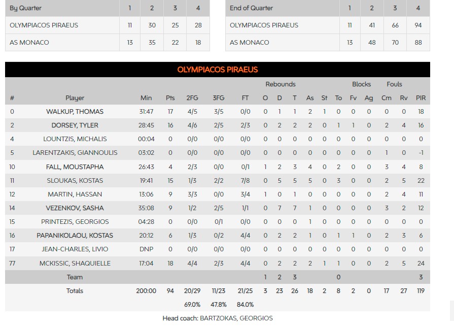 Ξεχώρισαν: Γουόκαπ (17π - 3/5τρ), Ντόρσεϊ (16π) και Σλούκας (15π - 5ασ - 5ρ) για τον Ολυμπιακό. Τζέιμς (24π - 2/10τρ - 10ασ) και Ουατάρα (15π - 5/7τρ) για τη Μονακό.