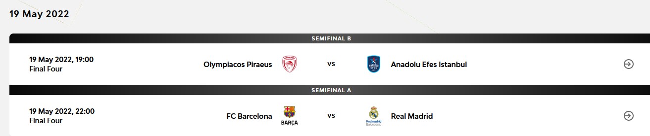 Έτσι, στις 19:00 ο Ολυμπιακός κοντράρεται με την πρωταθλήτρια Ευρώπης Αναντολού Εφές, ενώ στις 22:00 θα έχουμε το «classico» ανάμεσα στην Μπαρτσελόνα και την Ρεάλ Μαδρίτης.