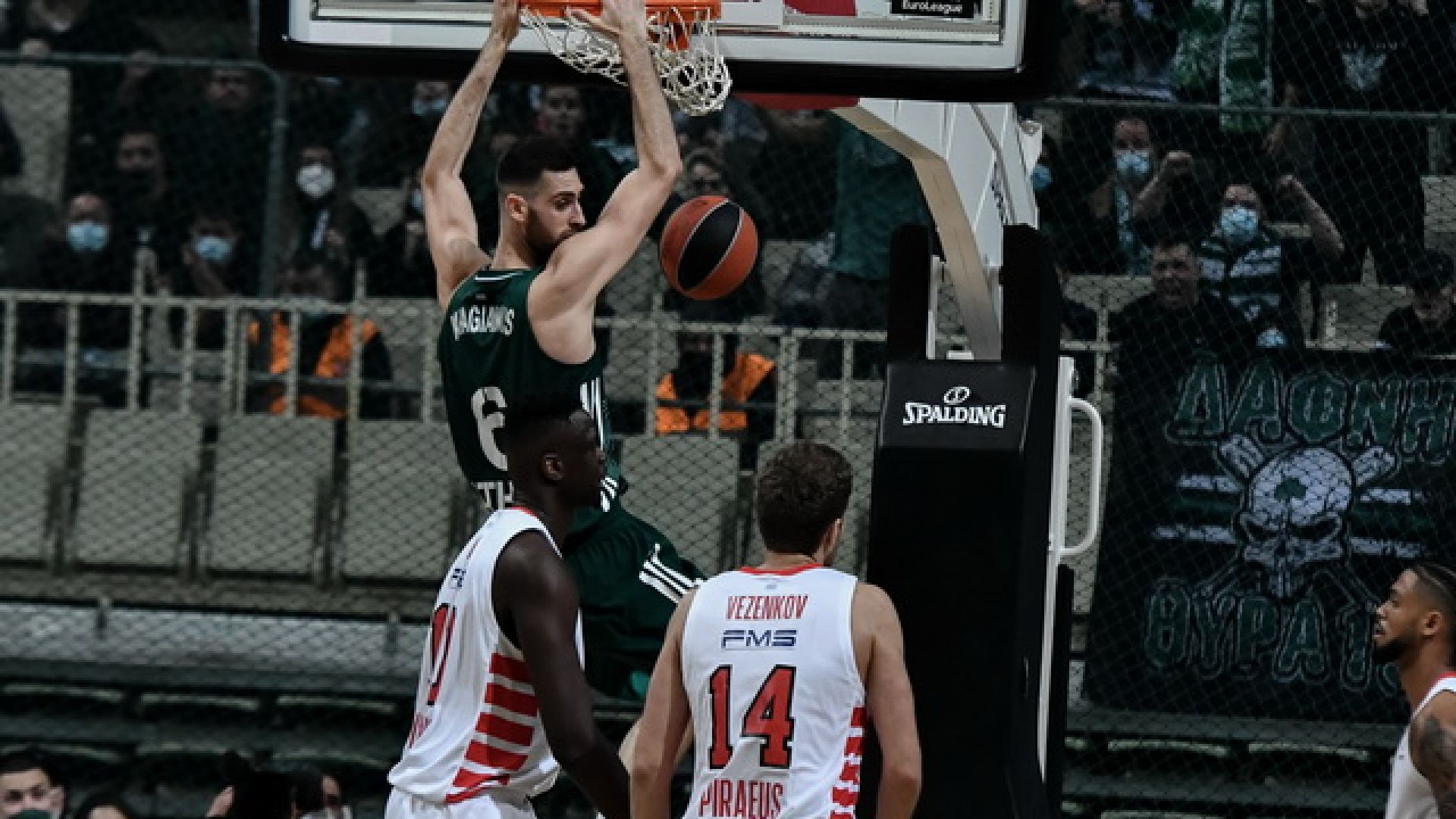 Ο σέντερ του Παναθηναϊκού βρίσκεται στο νο2, όταν αρχικά έκοψε τον Γιώργο Πρίντεζη και εν συνεχεία δέχτηκε την ασίστ του Μέικον για άλει ουπ κάρφωμα, από το «αιώνιο» ντέρμπι του ΟΑΚΑ.