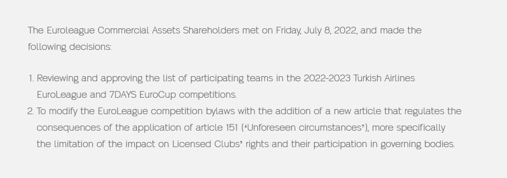 Με αυτή την αλλαγή μπαίνει οριστικό τέλος στις όποιες σκέψεις του μπλοκ των ισπανικών ομάδων, οι οποίες θεωρούσαν πως από την στιγμή που η ΤΣΣΚΑ έχει αποκλειστεί από την επόμενη Euroleague, δεν θα έπρεπε να συμμετέχει στην λήψη των αποφάσεων. Η αφορμή, φυσικά, δεν ήταν άλλη από την σύμπραξη των Ρώσων στο μπλοκ των ομάδων που αποφάσισαν την αποπομπή του Τζόρντι Μπερτομέου από την θέση του προέδρου και του CEO της Euroleague.