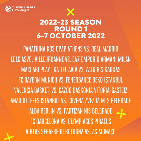 Η αντίστροφη μέτρηση για την έναρξη της σεζόν 2022/23 για την Euroleague έχει ξεκινήσει και η διοργανώτρια αρχή έδωσε το πρόγραμμα της πρεμιέρας, η οποία είναι προγραμματισμένη για το διήμερο 6-7 Οκτωβρίου.