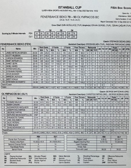 Η Φενέρ κατάφερε να κοιτάξει τον Ολυμπιακό στα μάτια μόνο στο πρώτο δεκάλεπτο (24-22). Από την 2η περίοδο και μετά, οι παίκτες του Γιώργου Μπαρτζώκα, με πρωτεργάτες τους Γουόκαπ και Πίτερς και ευχάριστη έκπληξη τον Πάπας, ανέβασαν την απόδοση τους, έκλεισαν το πρώτο μέρος στο +9 (40-49) και στο β’ μέρος κυριάρχησαν στο παρκέ, προηγήθηκαν μέχρι και με 20 πόντους (69-89 στο 35’), φτάνοντας με άνεση στην νίκη με 93-79.